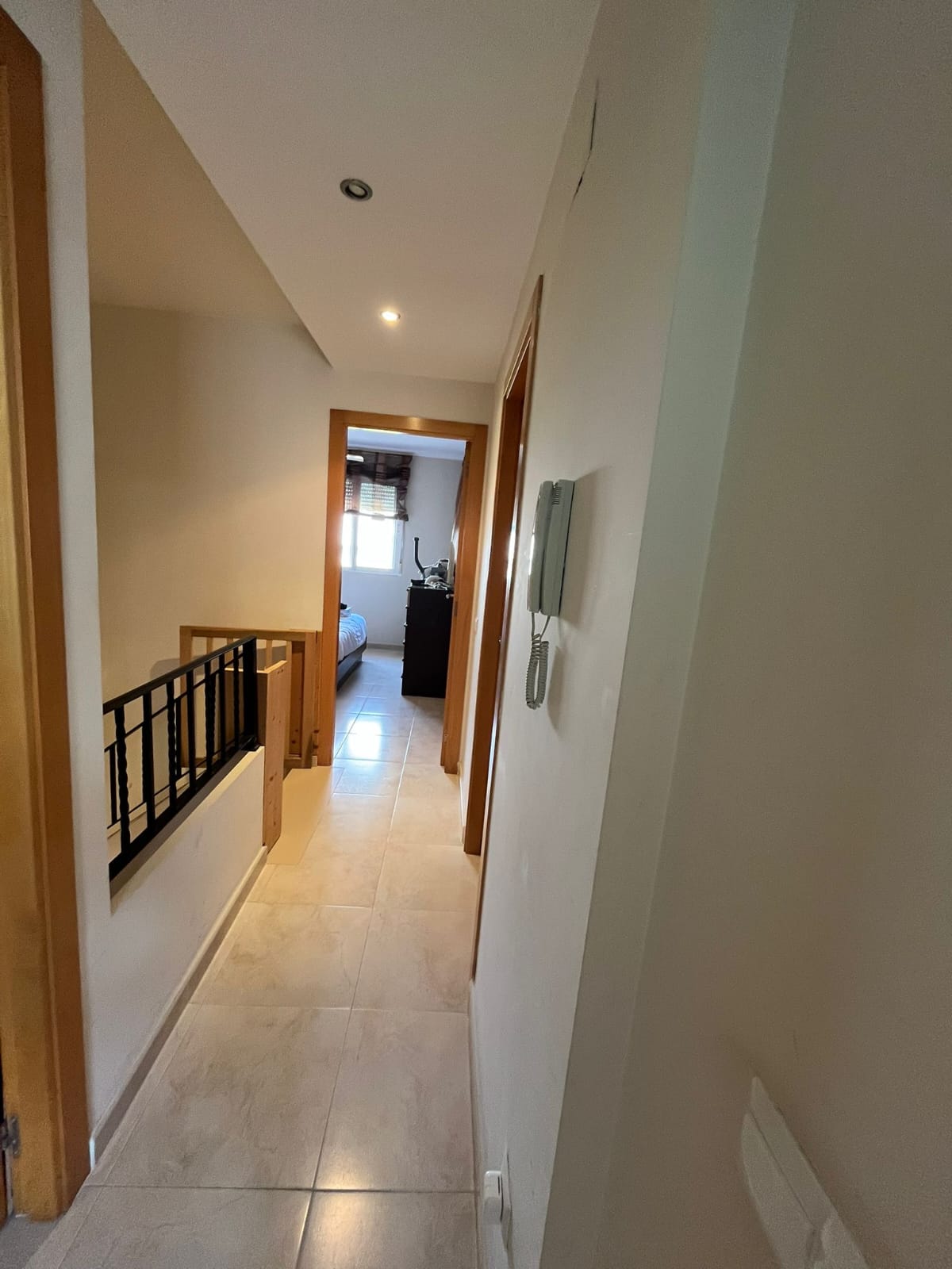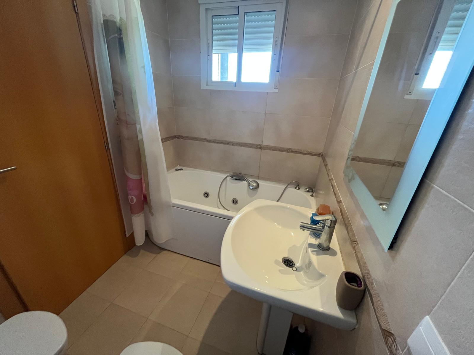 Planta superior con tres habitaciones. La habitación principal iluminada por una ventana y un pequeño balcón, estancia con armario empotrado y un baño privado con luz natural y bañera de hidromasaje.