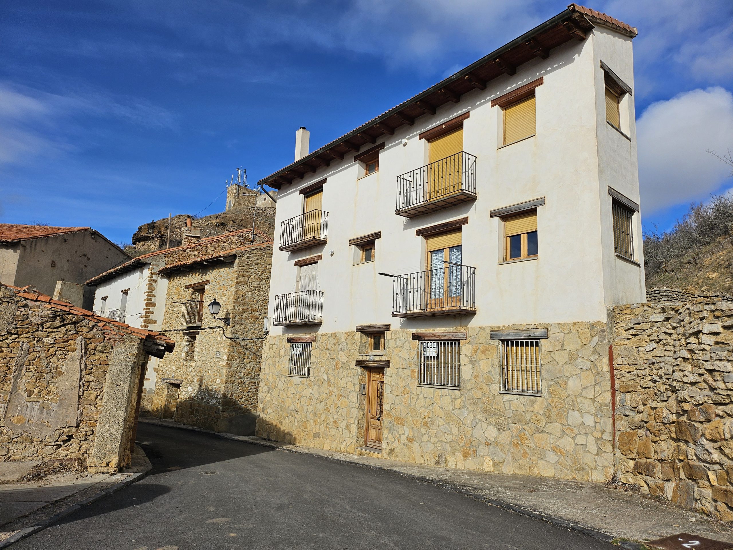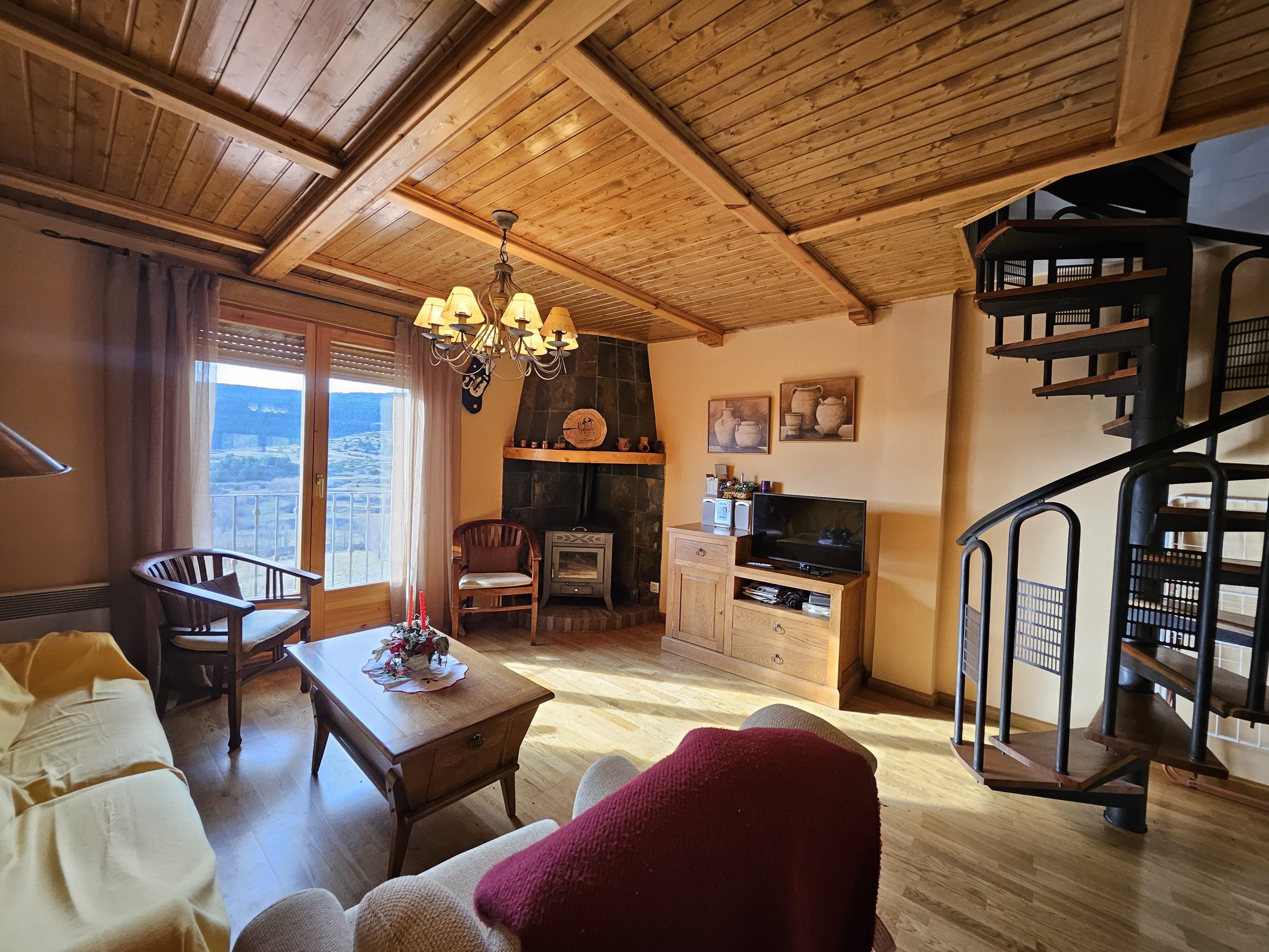 Balcón, estufa de leña y escalera de caracol para acceder a la segunda planta.