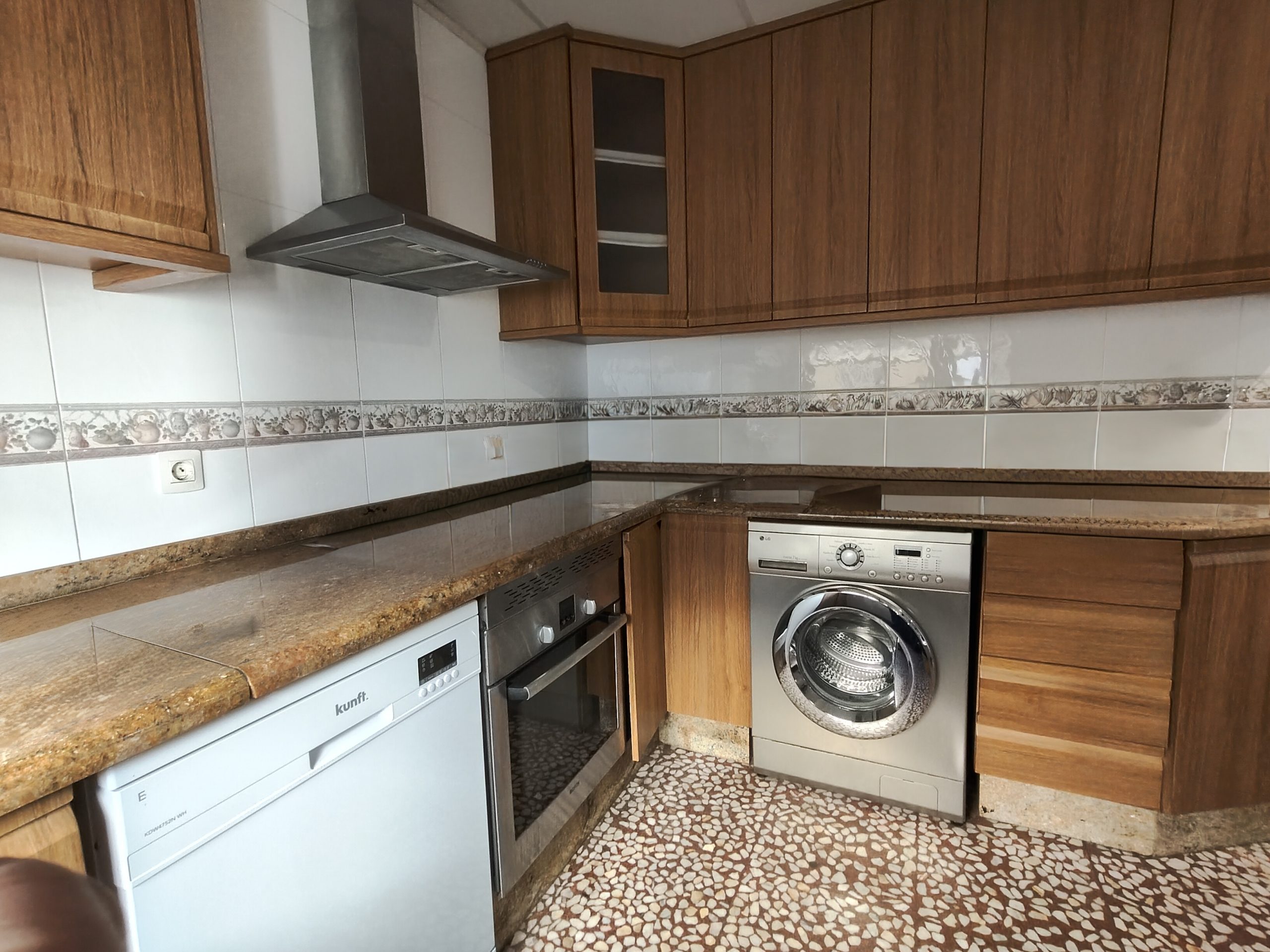 Cocina reformada en roble, con una gran bancada de trabajo de granito y con una acojedora zona comedor y descanso.