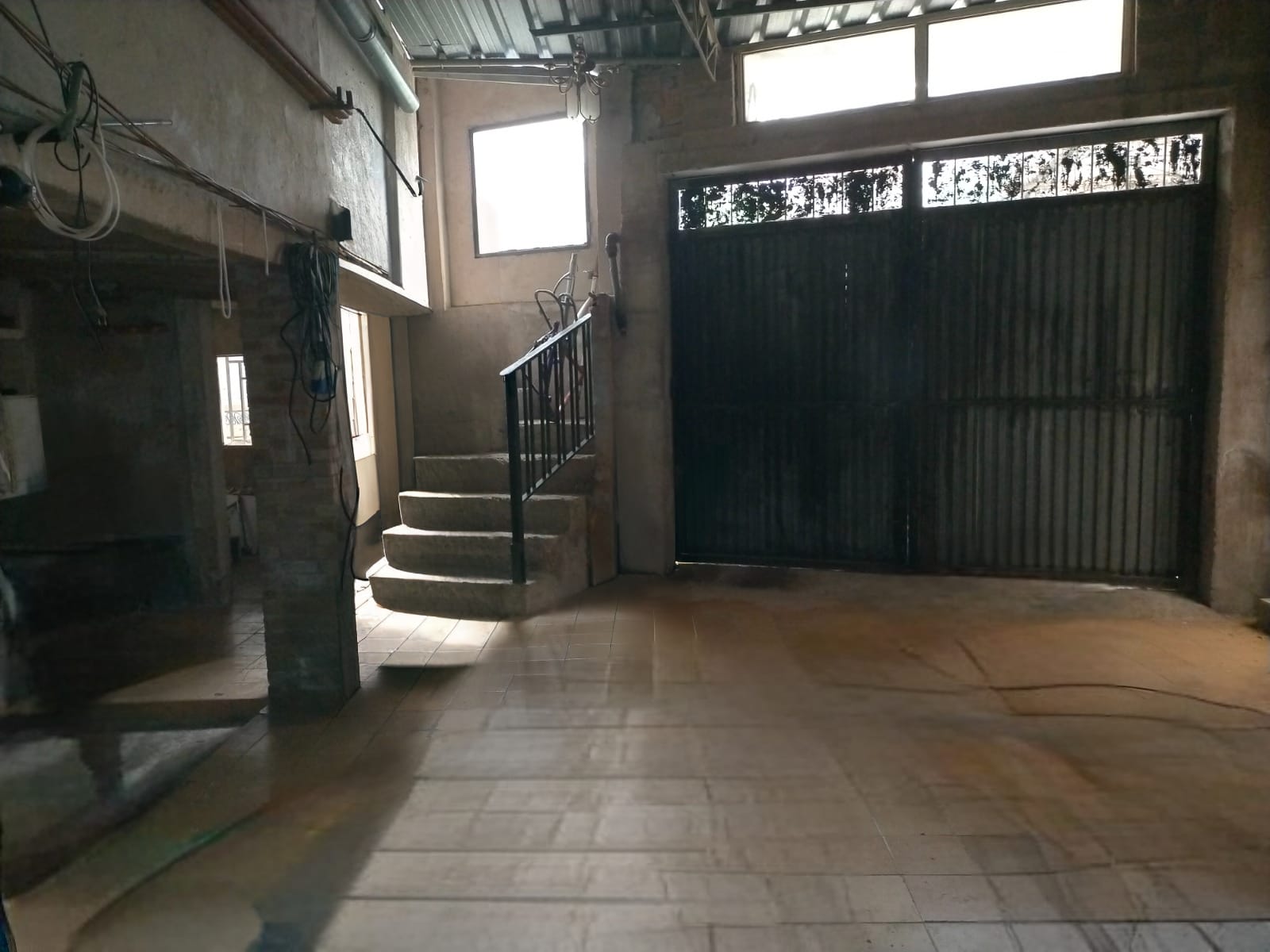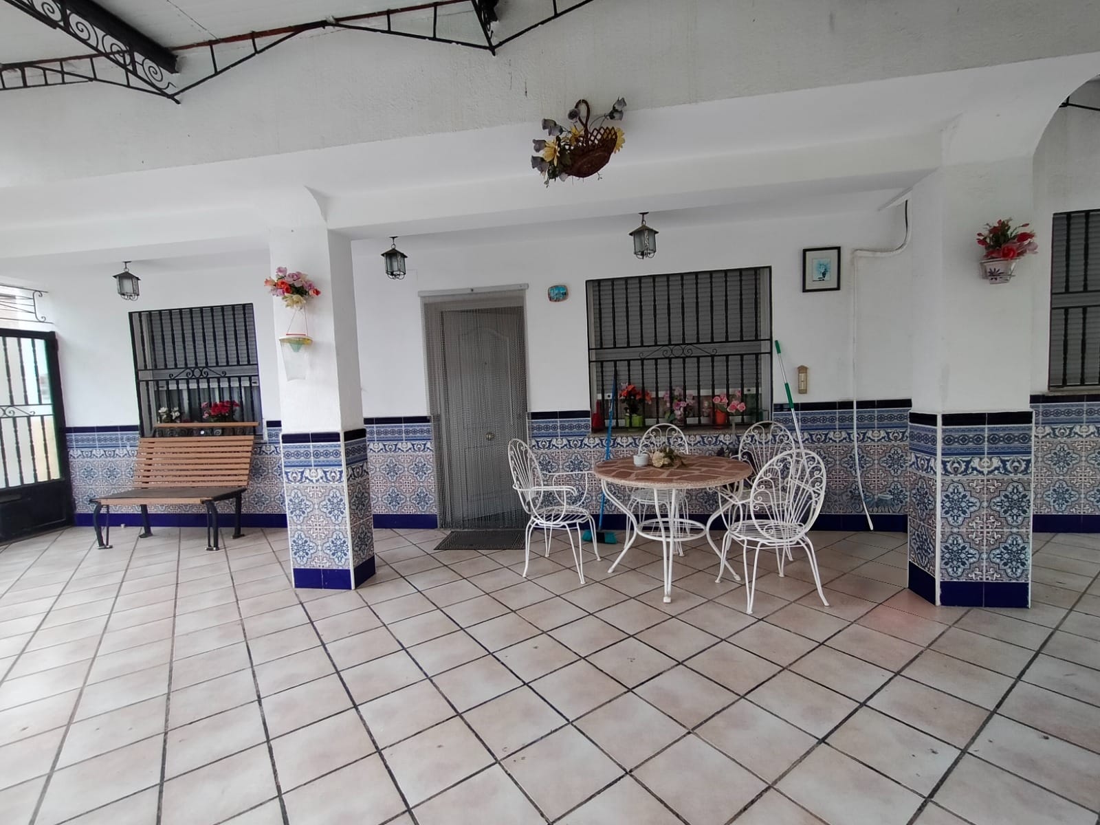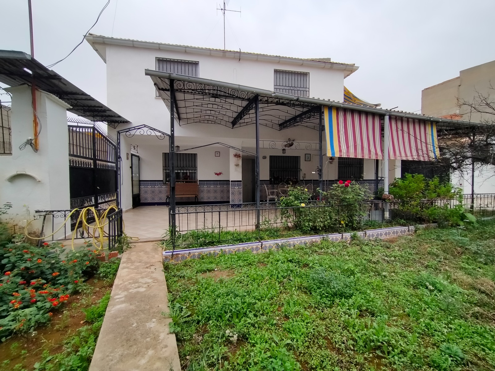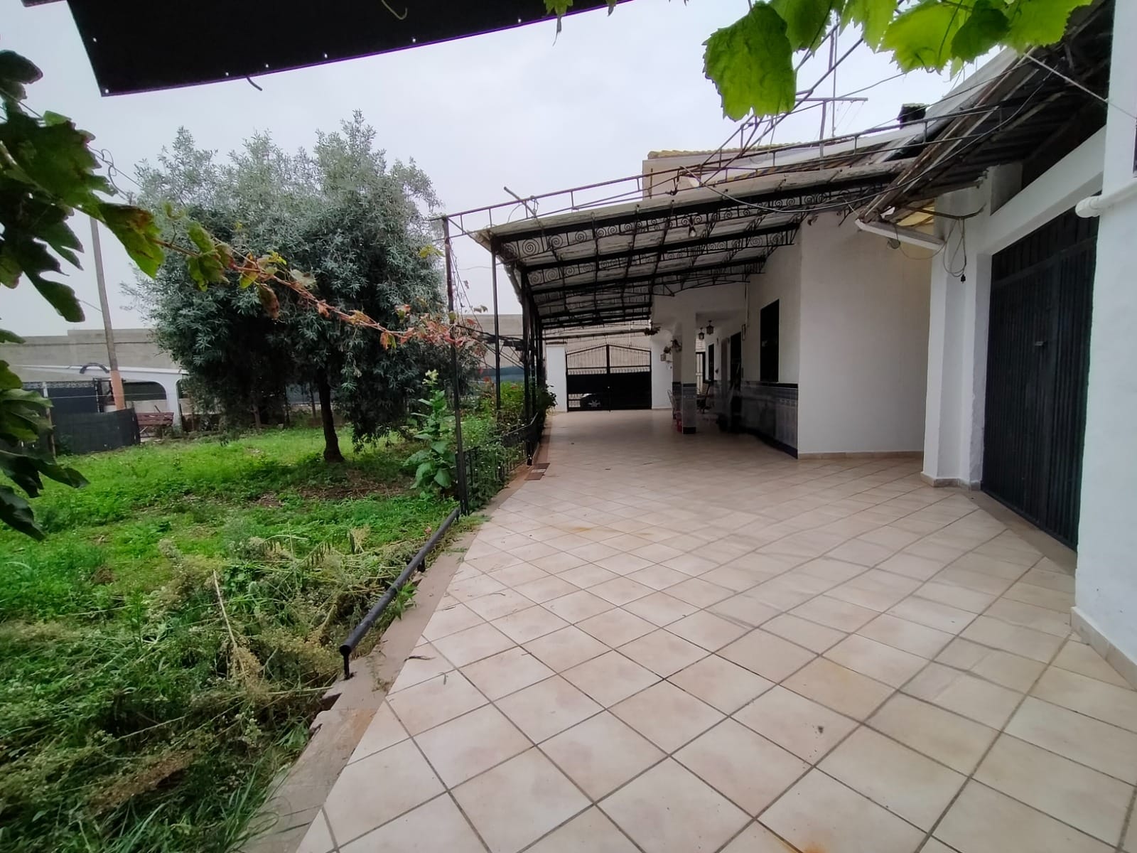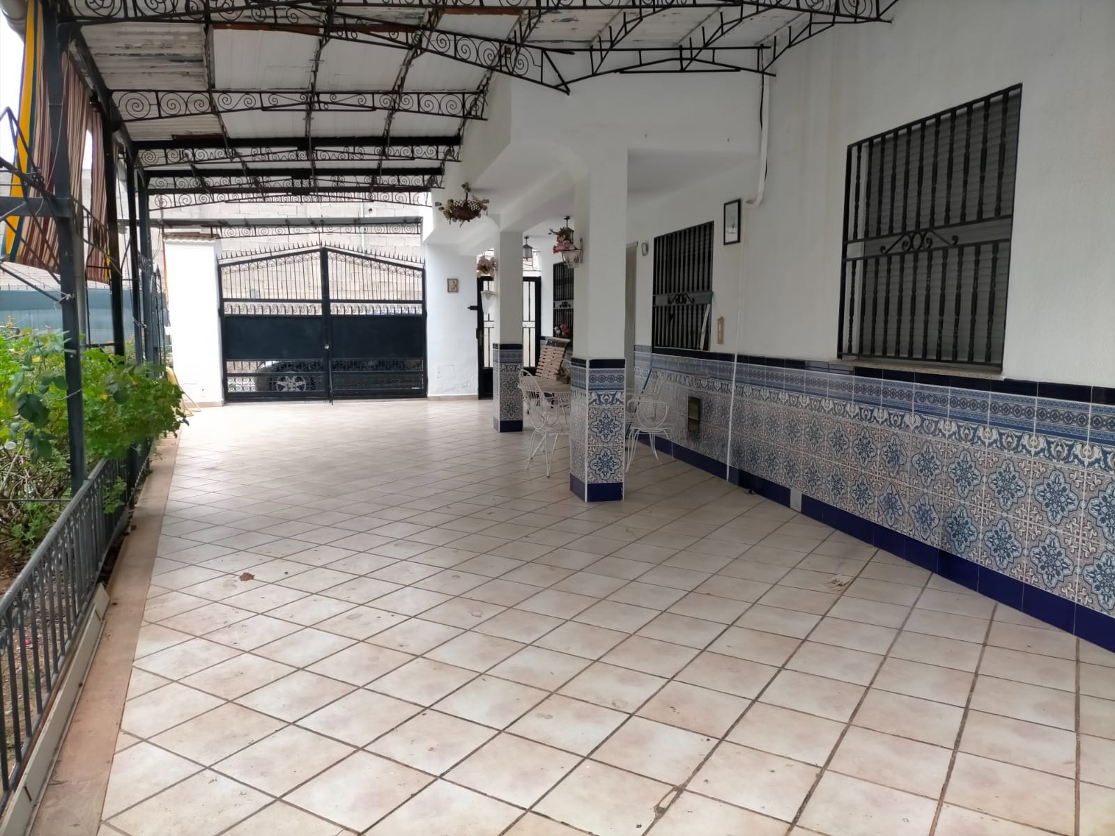 Entrada a la propiedad por puerta privada y puerta de doble hoja para vehículos accediendo a una terraza con porche donde tenemos la puerta de entrada a la vivienda.