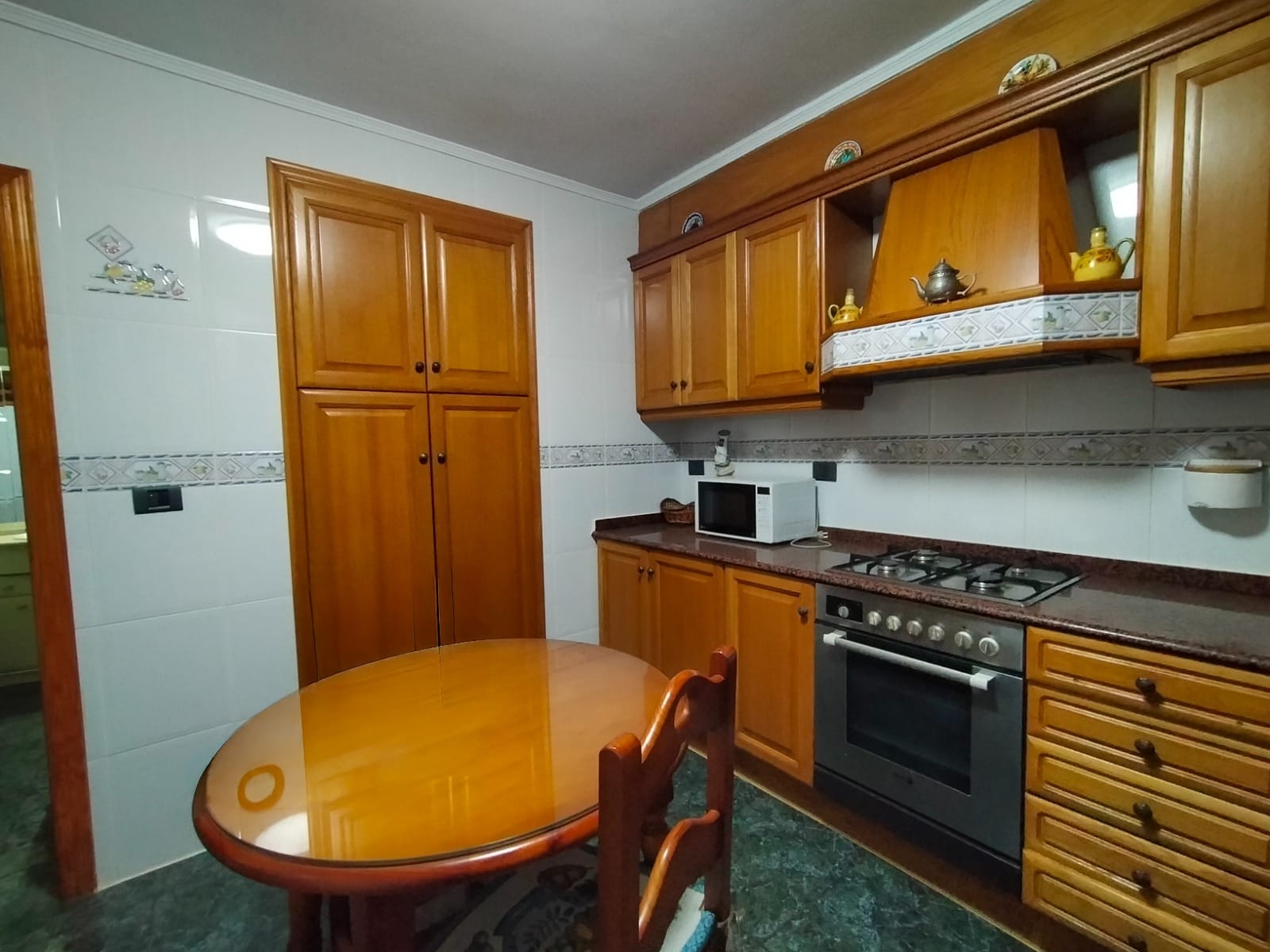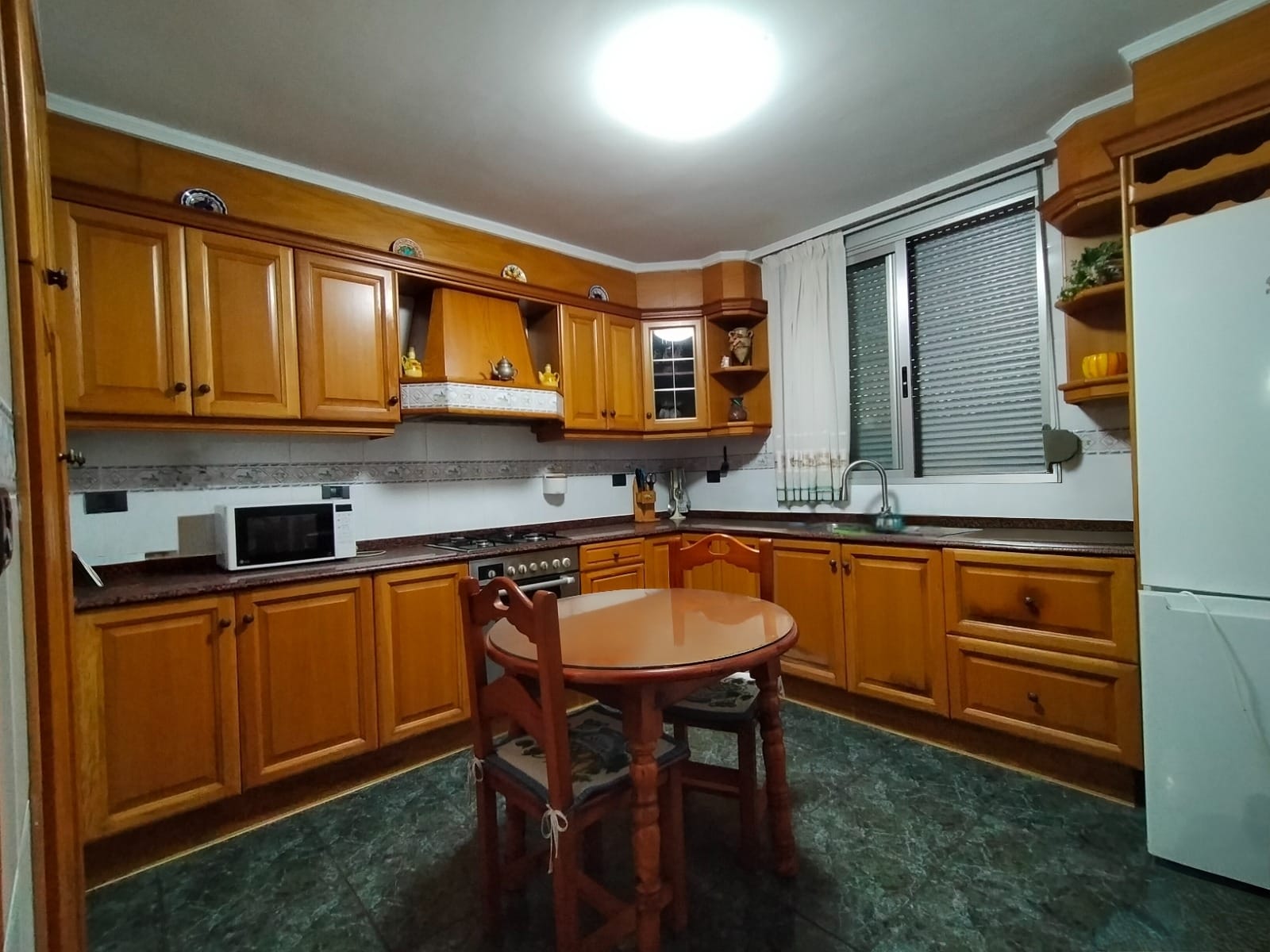 La cocina es una cocina office en roble con una gran bancada angular de granito y un armario despensa además de los abundantes armario para el almacenaje.