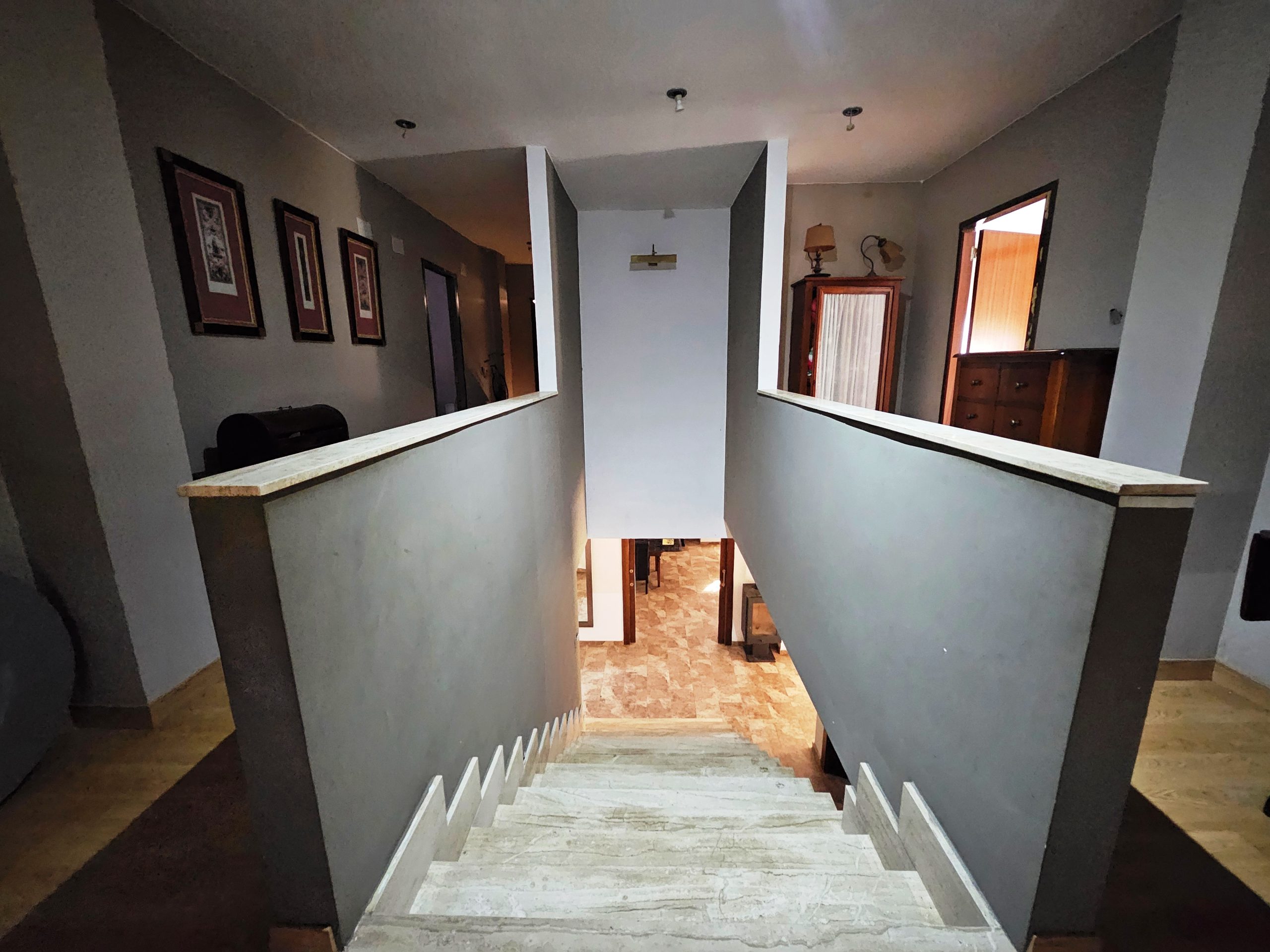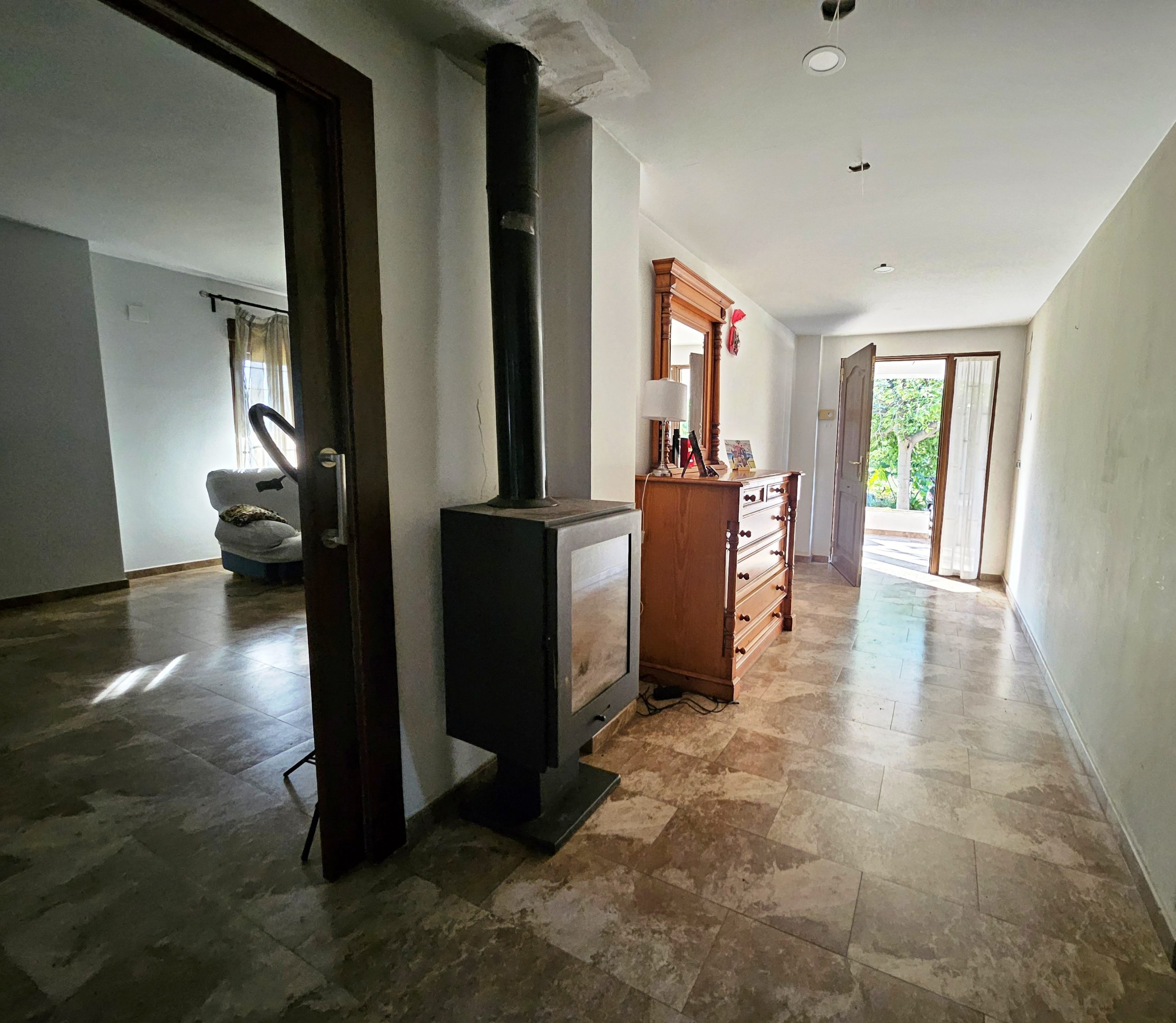 En el mismo distribuidor se encuentra el acceso al garaje y una escalera central que nos lleva a la planta superior y como mención especial en el centro del distribuidor hay una estufa de leña que en invierno caldea las zonas abiertas de la vivienda.