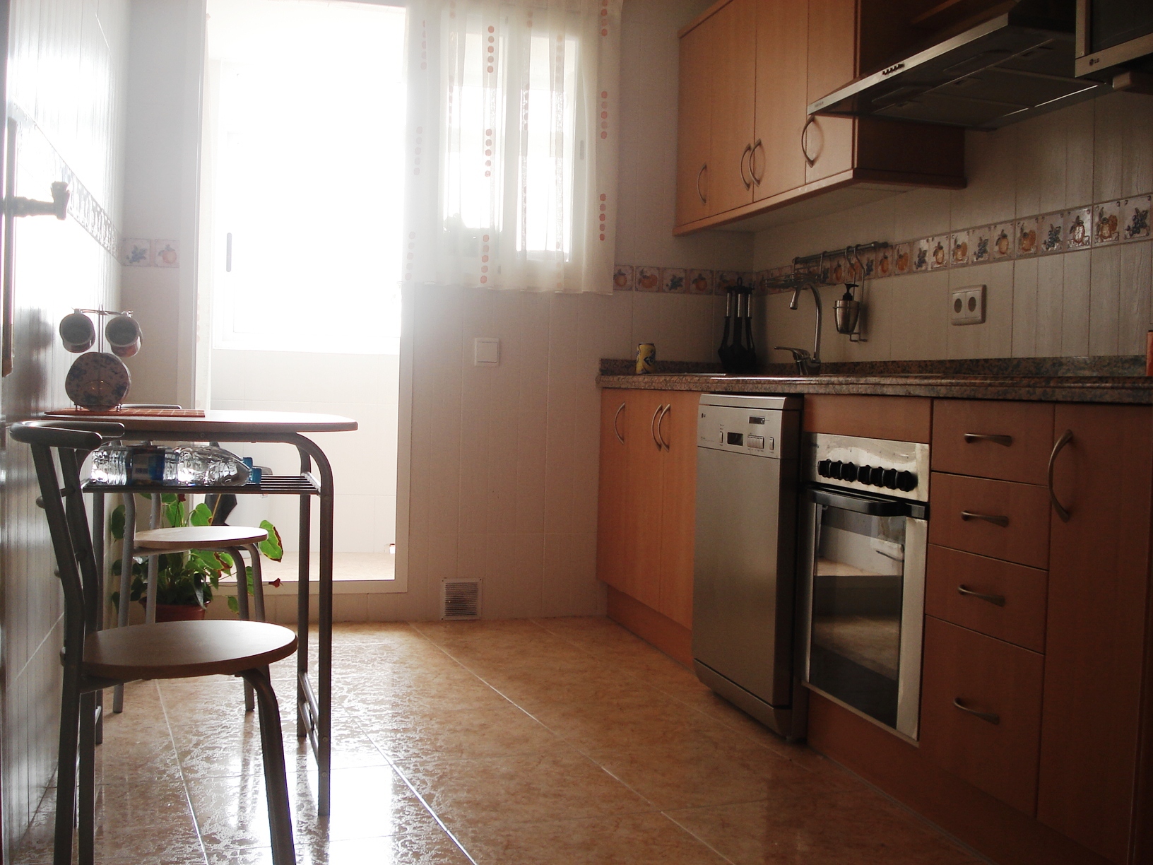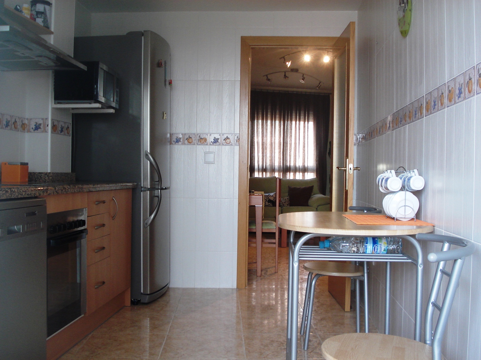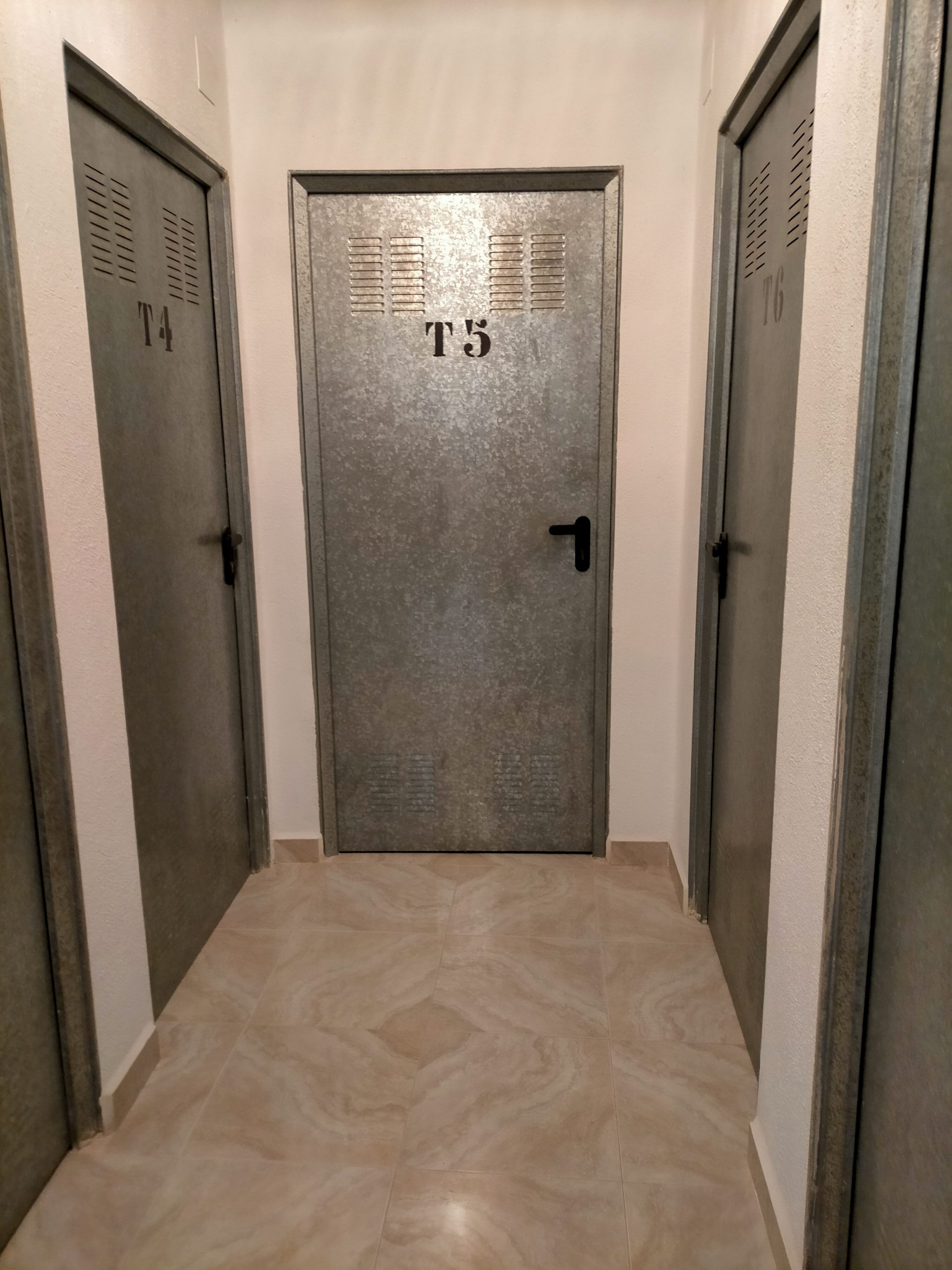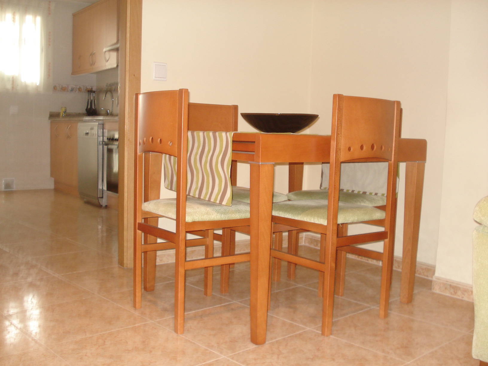Suelo en gres porcelánico, ventanas en aluminio tipo climalit y puertas en pino.