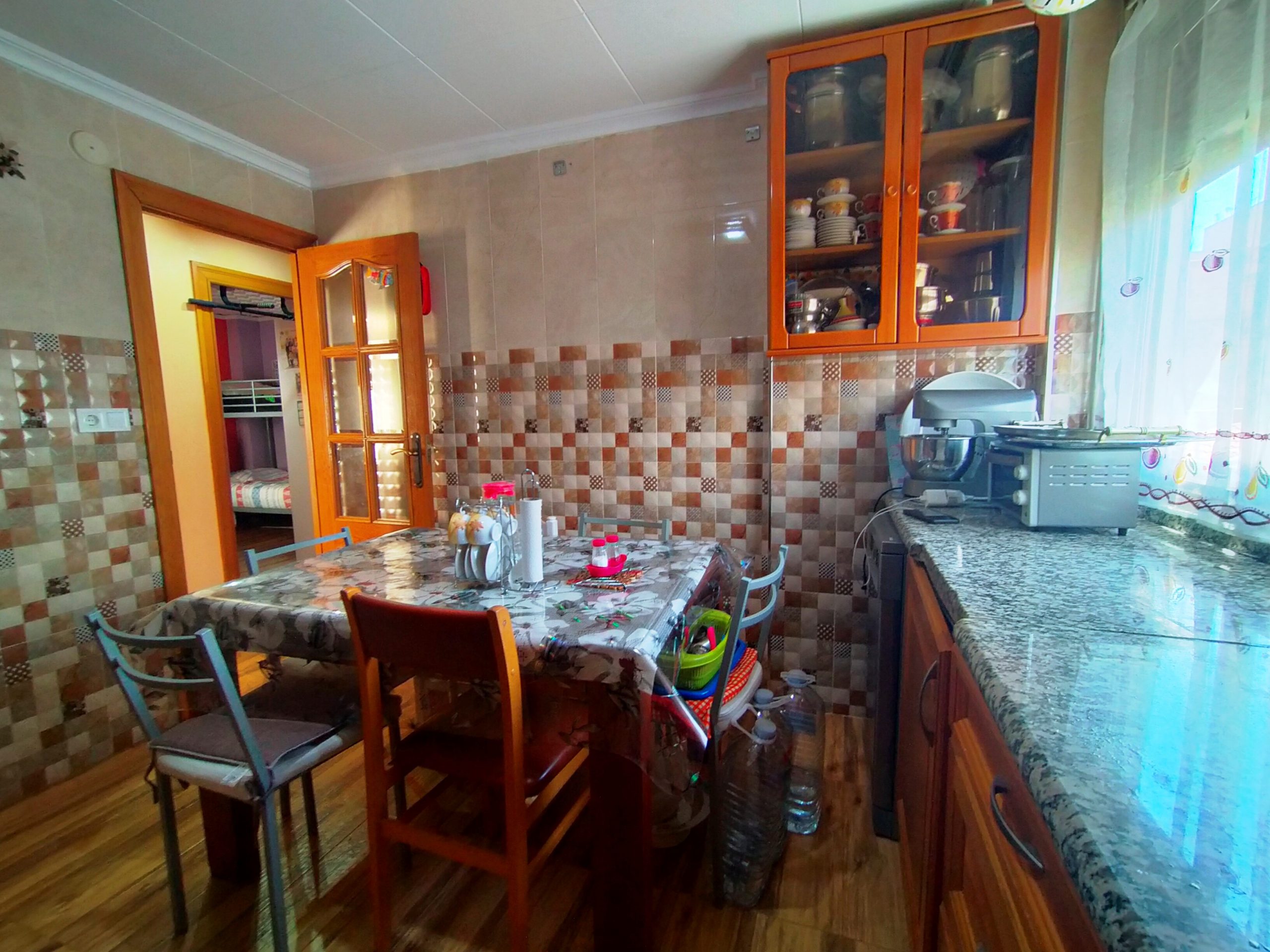 Suelo en gres, puertas en madera y ventanas en aluminio.