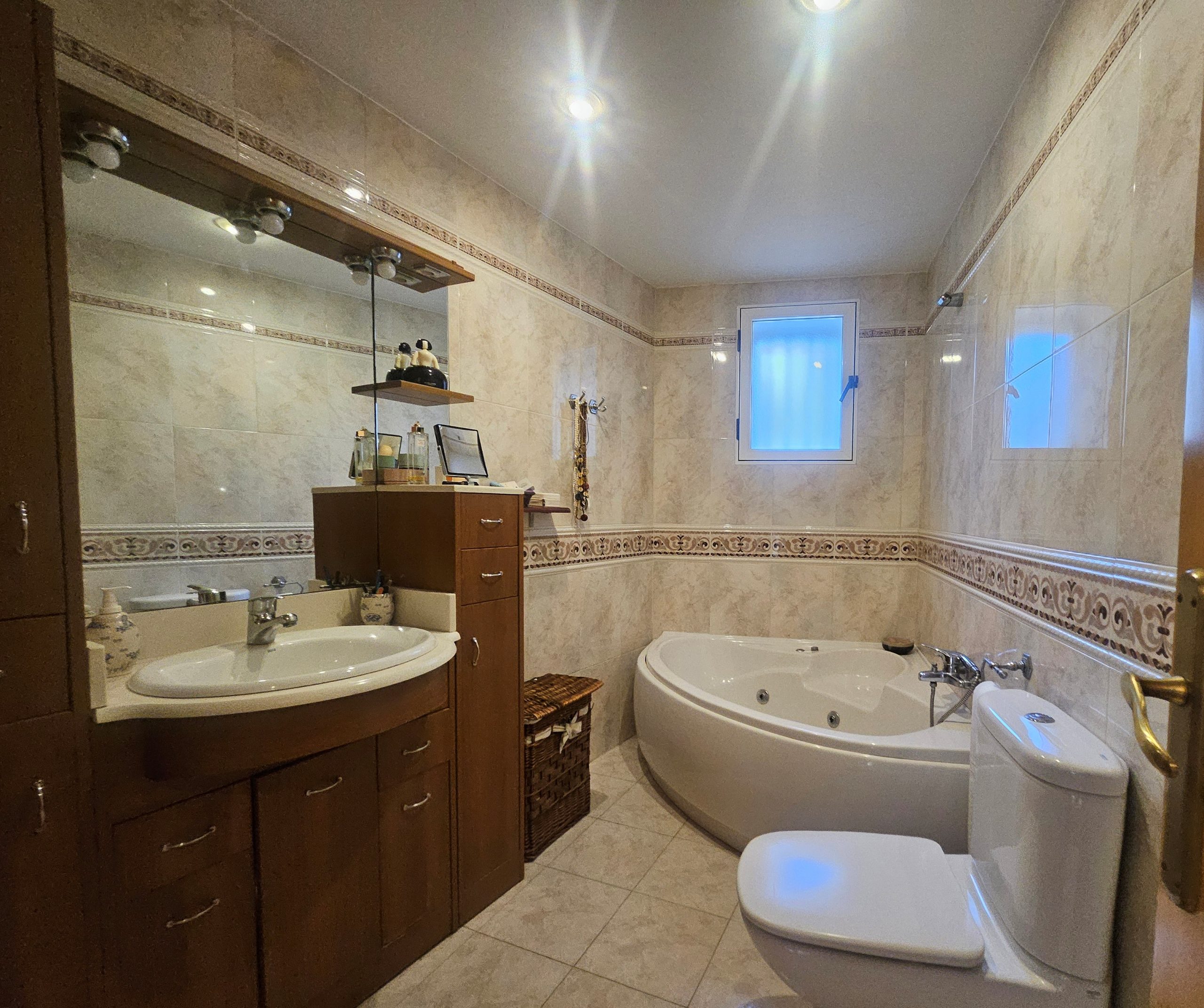 En la vivienda tenemos tres baños, el privado del dormitorio principal con una gran bañera esquinera de hidromasaje y luz natural. Un segundo baño con cabina de ducha y tambien con luz natural. El tercer baño es interior, es de cuatro piezas y este con bañera.