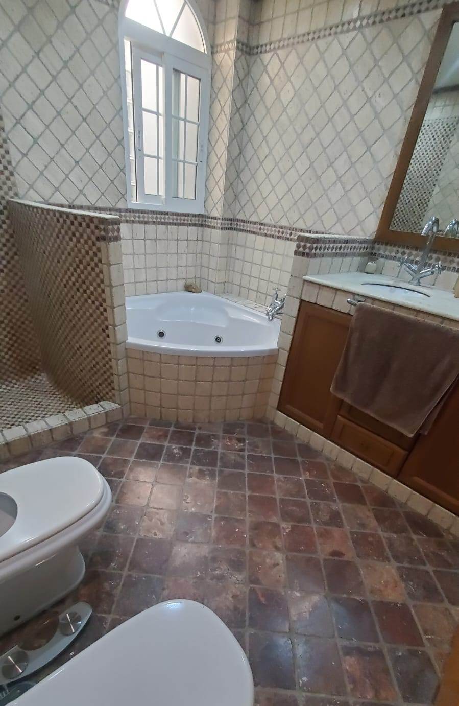 Dormitorio principal con gran armario empotrado de seis puertas y espectacular baño privado de cinco piezas, dos de ellas bañera esquinera de hidromasaje y ducha.